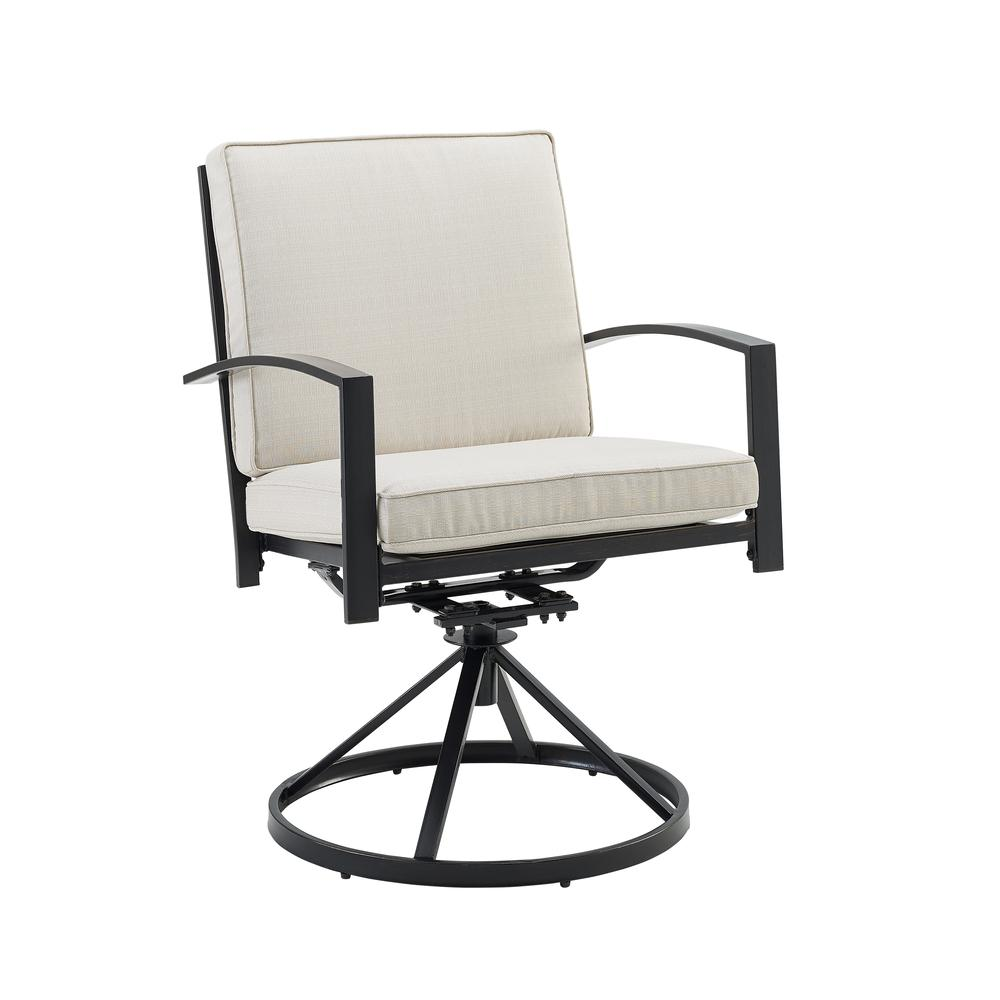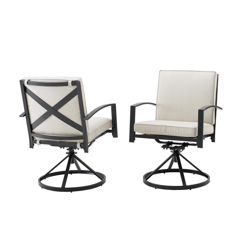 Outdoor dining is fashionable and fun with the Kaplan 2pc Swivel Dining Chair Set. The weather-resistant steel provides a sturdy framework for the 360-degree swivel base, creating a perfect companion to your outdoor dining table or seating area. The combination of comfortable, cushioned seats with a transitional design makes these outdoor chairs a welcome addition to your outdoor retreat.