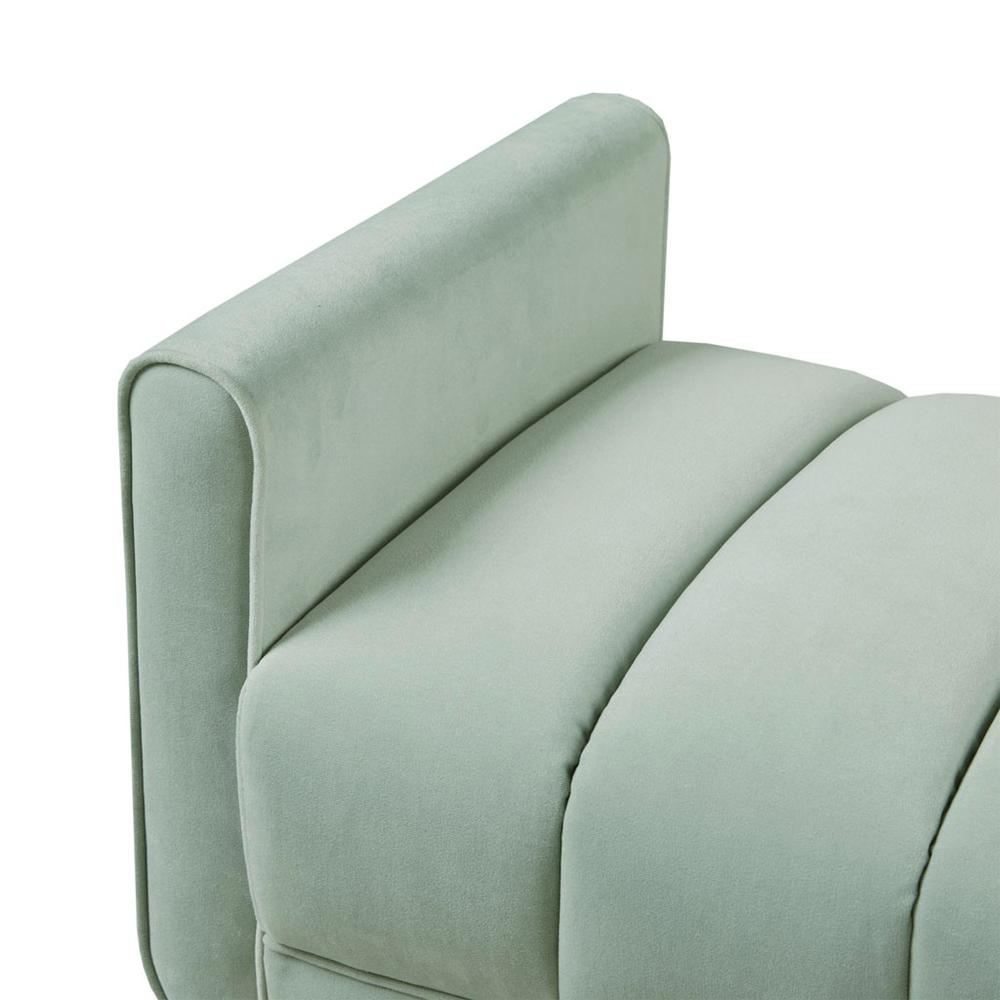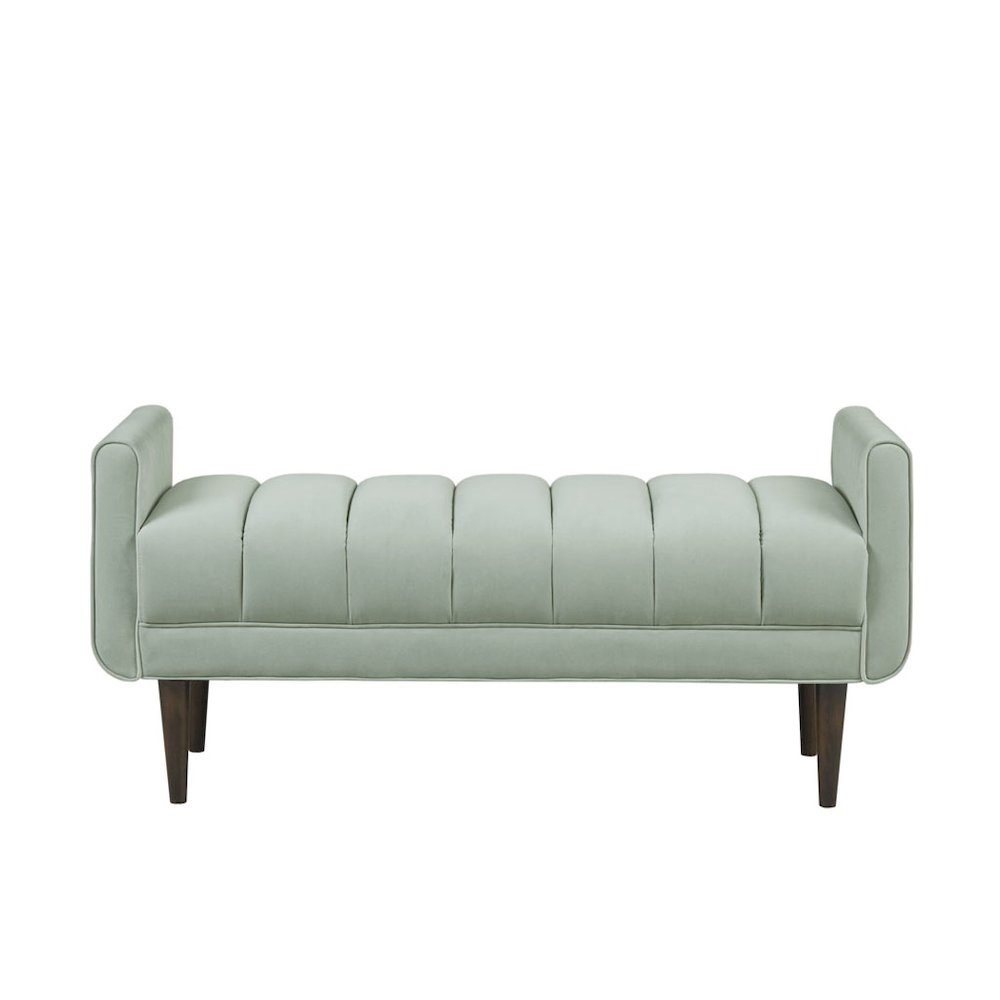 Sleek and elegant, the Madison Park Linea bench seat embraces a chic minimalistic design to elevate your bedroom, living room, or entryway. Deep, wide channels on the seat and welt piping along the edges give this upholstered bench a refined modern look. The velvet polyester upholstery adds a luxuriously soft element to the design, while the raised sides frame the seat of the bench to create a glamorous silhouette. Contrasting tapered solid wood legs provide sturdy and stylish finishing touched to complete this upholstered bench. Assembly is required.