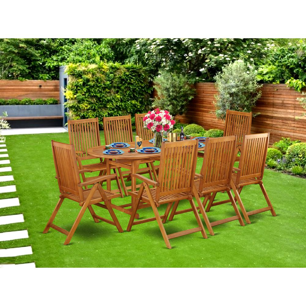 This 9 Piece Acacia Solid wood Backyard Sets offers one outdoor table and Eight foldable outdoor chairs This natural outdoor chair is resistant to water and mold as well as a sustainable resource, acacia wood is a must-have material for outdoor furniture. The outdoor chair set will be the perfect piece for you patio, backyard, porch, or deck. Crafted f Outdoor Table Has 19.6 In Self Storage Leaf That Could Be Stored Right Below Table Top Sets up with simplicity or folds away easily when not in use. All required hardware and a step-by-step assembly manual are included