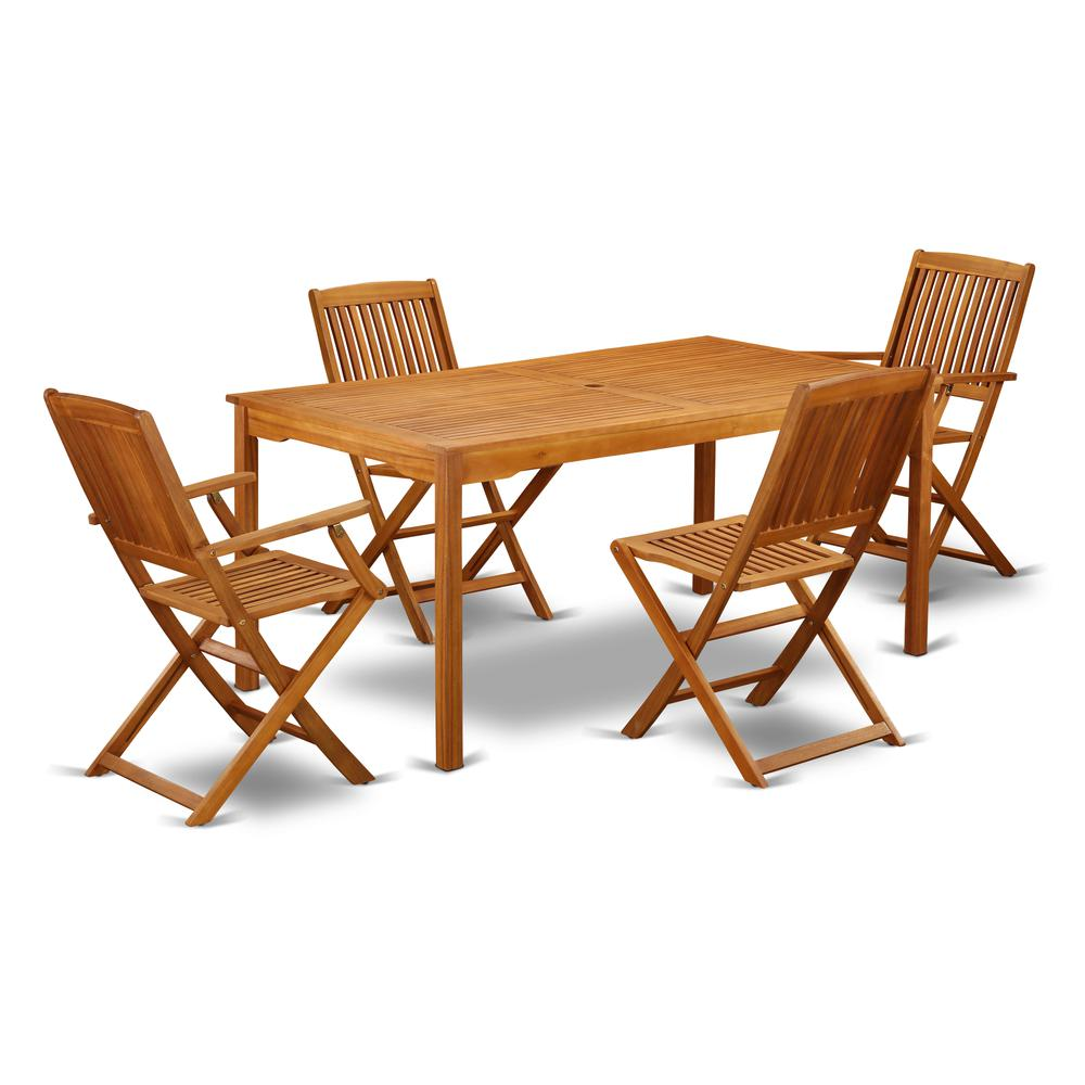 This 5 Pc Acacia Wood Courtyard Dining Sets offers an outdoor table and four patio dining chairs This rustic outdoor chair is resistant to water and mold as well as a sustainable resource, acacia wood is a must-have material for outdoor furniture. The outdoor chair set will be the perfect piece for you patio, backyard, porch, or deck. Crafted fr The neutral finish complements an earthy color palette and brings the organic appeal to any space. Sets up with ease or folds away quickly whenever not in use. All required hardware and a step-by-step assembly manual are included