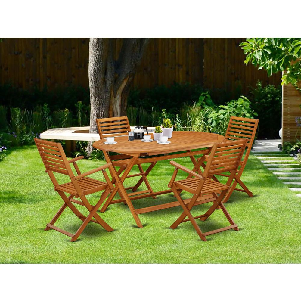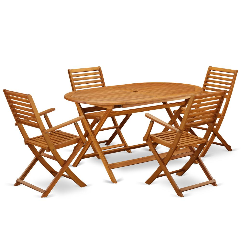 This 5 Piece Acacia Wooden Courtyard Dining Sets offers an outdoor table and 4 chairs This rustic outdoor arm chair is resistant to water and mold as well as a sustainable resource, acacia wood is a must-have material for outdoor furniture. The outdoor arm chair set will be the perfect piece for you patio, backyard, porch, or deck. Cr The neutral finish complements an earthy color palette and brings the organic appeal to any space. Sets up with easiness or retracts away quickly when not in use. All required hardware and a step-by-step assembly manual are included