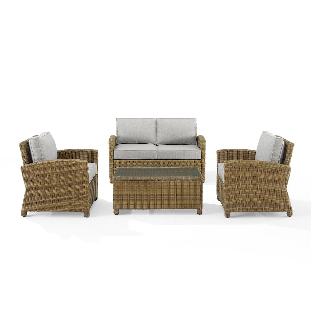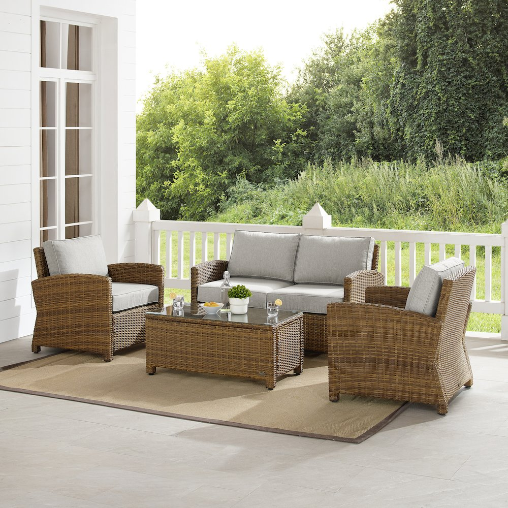 TRADITIONAL OUTDOOR FURNITURE: Built to endure the elements, this patio furniture set has a weather-resistant powder-coated steel frame and handwoven UV-resistant all-weather half-round resin wicker in a weathered brown finish. Featuring 5" thick seat cushions and 4" thick back cushions with moisture-resistant cushion cores, this set offers exceptional comfort. The gray cushion covers are made from solution-dyed polyester, which resists sun fade and abrasion. EASY CARE: Outdoor furniture care is easy thanks to the removable machine-washable cushion covers. The patio table includes a tempered glass top for quick cleaning, while adjustable levelers on the legs ensure stability on uneven surfaces. PERFECT FOR ENTERTAINING: This patio set provides seating for up to four people, it includes a loveseat (55"W x 31.75"D x 32.5"H), two chairs (30.5"W x 31.75"D x 32.5"H), and a coffee table (40"W x 21"D x 17.75"H) with a 50-lb weight limit. AMERICAN LEGACY: Inspired by over 100 years of the Crosley legacy, Crosley Furniture offers style for every space, from retro to modern. Crosley products are proudly designed in the USA and come with USA-based customer support. UV resistant all-weather half-round resin wicker Weather-resistant powder-coated steel frame Gray outdoor cushion covers High-performance solution-dyed polyester cushion covers resist sun fade and abrasion to keep your outdoor patio furniture looking good Moisture-resistant high grade cushion cores Removable cushion covers are machine washable Patio table has a tempered glass top Adjustable levelers on legs