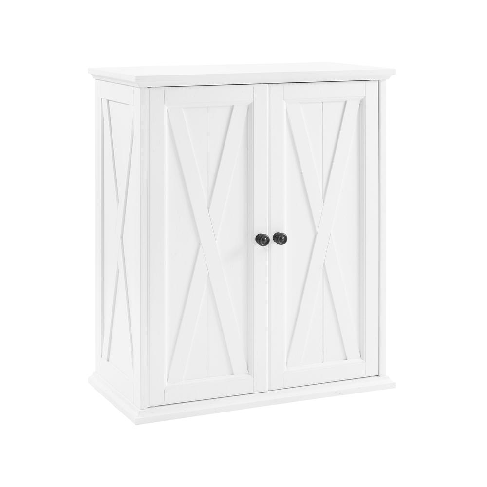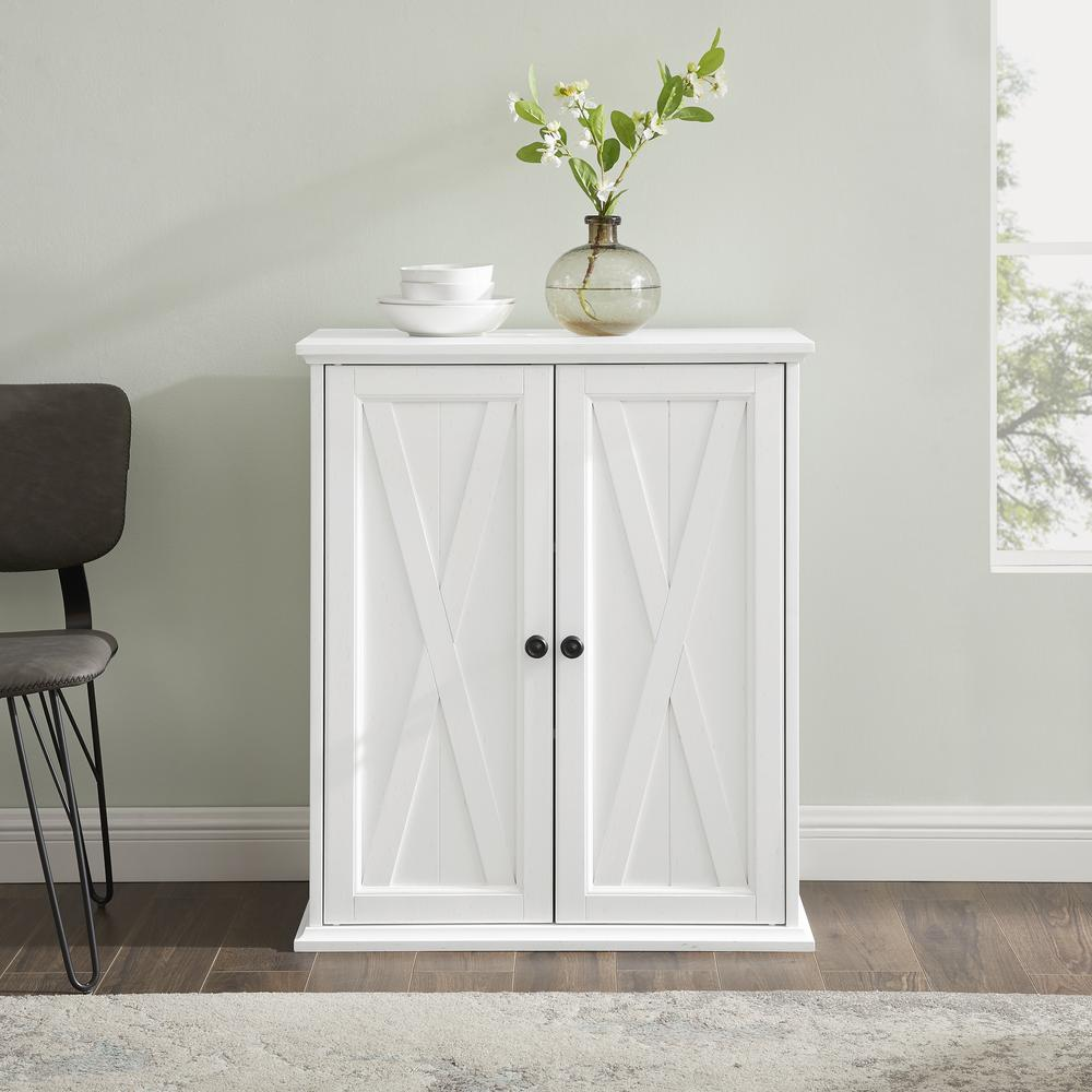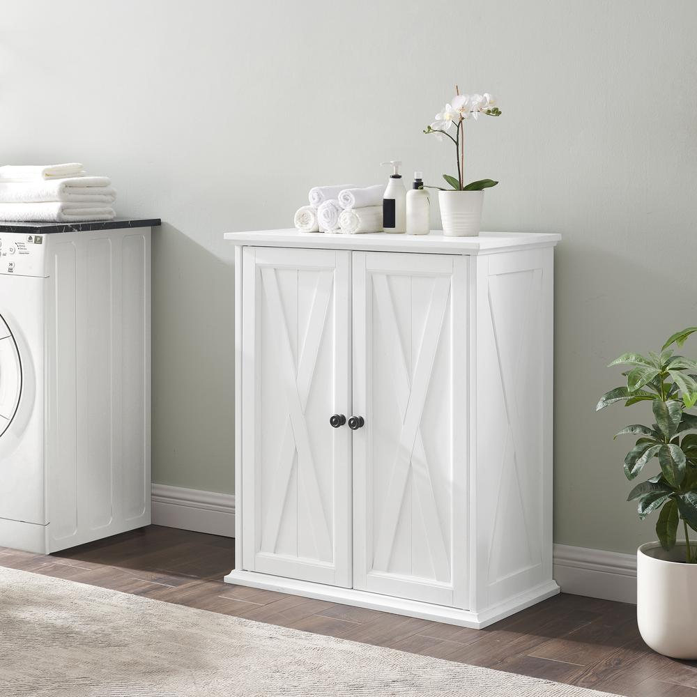 Distressed white finish Genuine metal hardware in a gunmetal finish Two adjustable and removable shelves, each with a 15lb weight limit Includes metal plate for stacking two units together Second unit for stacking is sold separately Can be used as a linen cabinet, a coffee bar cabinet, or for laundry room storage Pairs well with traditional decor