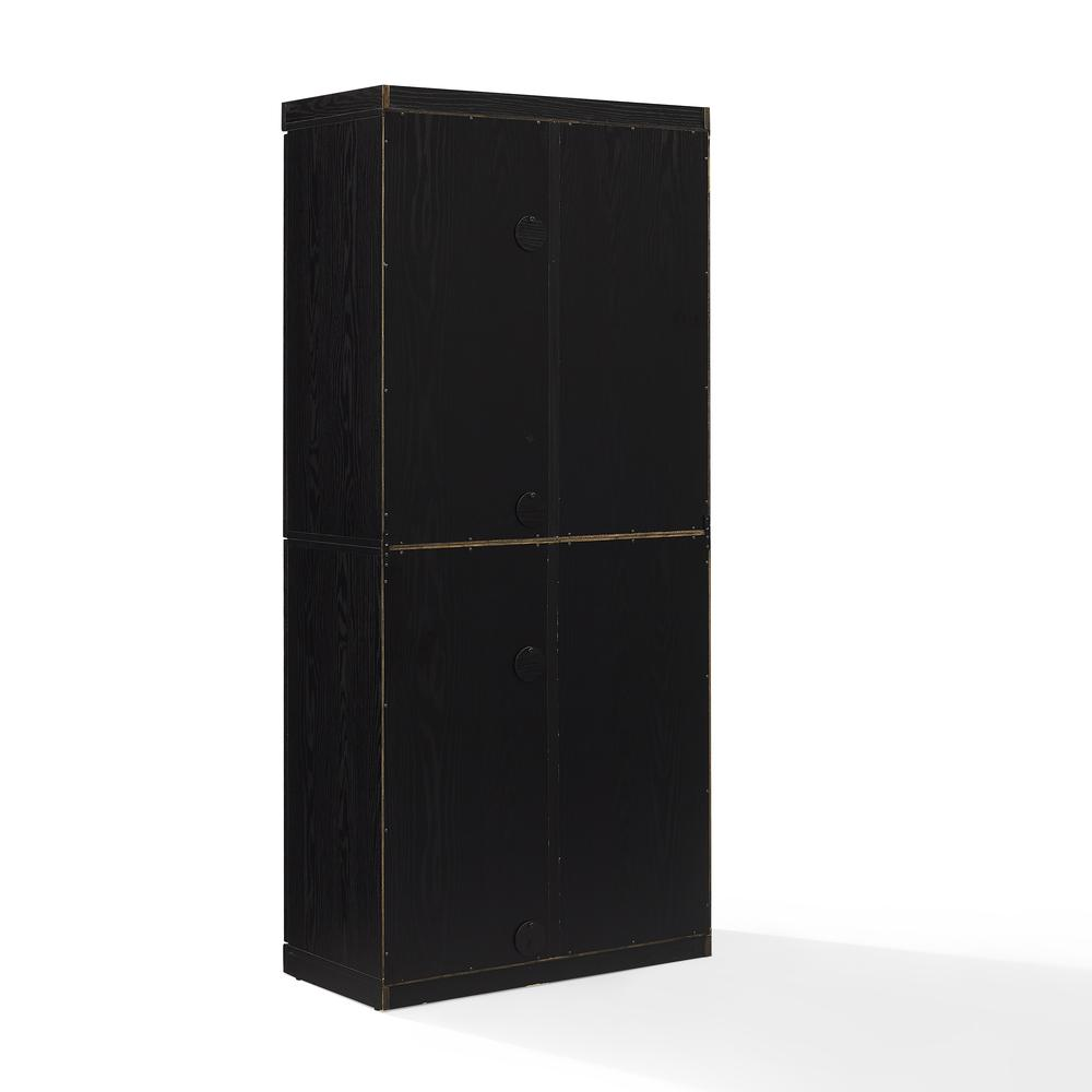 Black finish with wood-grain detailing Wood storage cabinet block pulls with black wood-grain detailing Two adjustable and removable shelves per storage cabinet, each with a 15lb weight limit Four pre-cut cable management holes with swivel covers Includes metal plate for stacking two units together Can be used as a linen cabinet, coffee bar cabinet, or bookcase Modular design allows multiple units to be paired together for expanded organization and storage Pairs well with traditional, modern farmhouse, mid-century, and minimalist decor