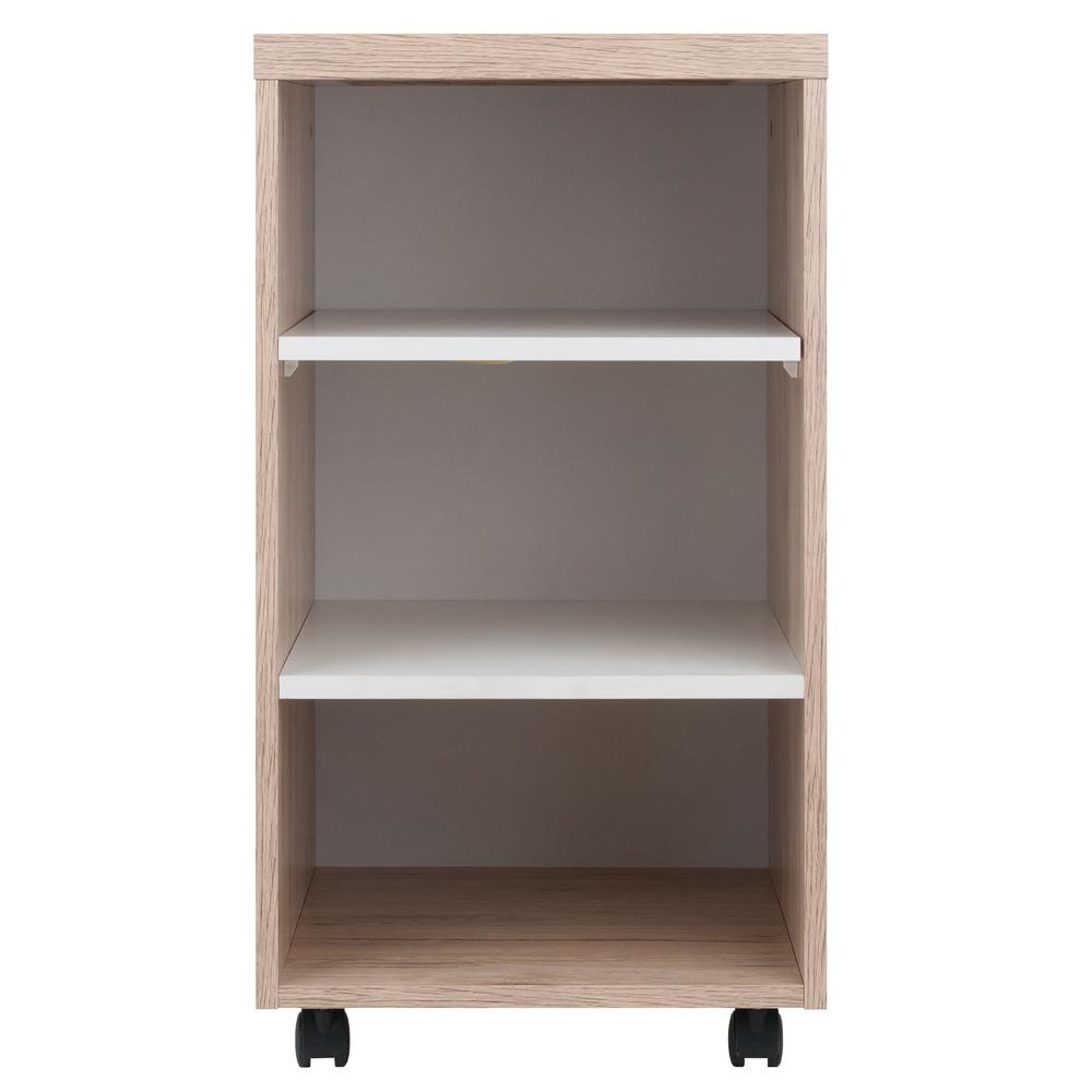Creates a customized desk or storage console Made of sturdy composite wood 3 open shelves with adjustable upper shelf Rolls easily on casters, 2 of which lock Ships in 1 box