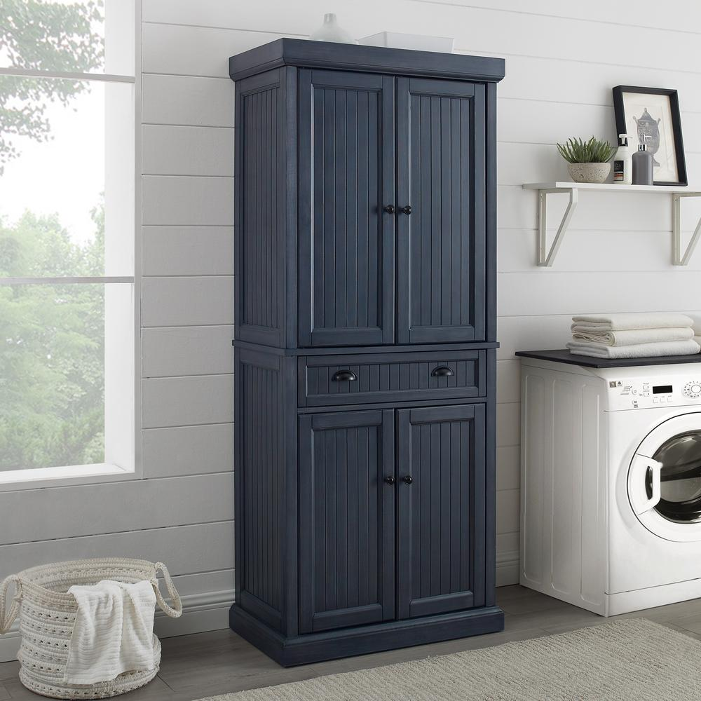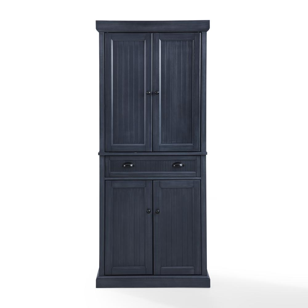 COASTAL STYLE: This storage pantry, featuring a hand-rubbed, distressed navy finish and beadboard paneling, brings beachy vibes to your kitchen. The antique black-finished metal hardware enhances its coastal charm. SPACIOUS STORAGE: The pantry features two cabinets with double doors, magnetic closures, and adjustable shelves. Each adjustable shelf has a weight capacity of up to 15 lbs. CONVENIENT DRAWER SPACE: The kitchen pantry has a full-extension drawer on smooth ball-bearing glides, supporting up to 15 lbs. CLASSIC DESIGN: This storage cabinet showcases timeless design elements that complement modern farmhouse and traditional décor. It can be used as a linen cabinet, a coffee bar, or for laundry room storage. AMERICAN LEGACY: Inspired by over 100 years of the Crosley legacy, Crosley Furniture offers style for every space, from retro to modern. Crosley products are proudly designed in the USA and come with USA-based customer support. Distressed navy finish Genuine metal hardware in an antique black finish Two large pantry cabinets with double doors and magnetic closures Two adjustable and removable shelves in each storage cabinet with a 15lb weight limit per shelf One large kitchen storage drawer on full-extension ball-bearing glides with a weight limit of 15lbs Pairs well with traditional and modern farmhouse decor Can be used as a linen cabinet, a coffee bar cabinet, or for laundry room storage