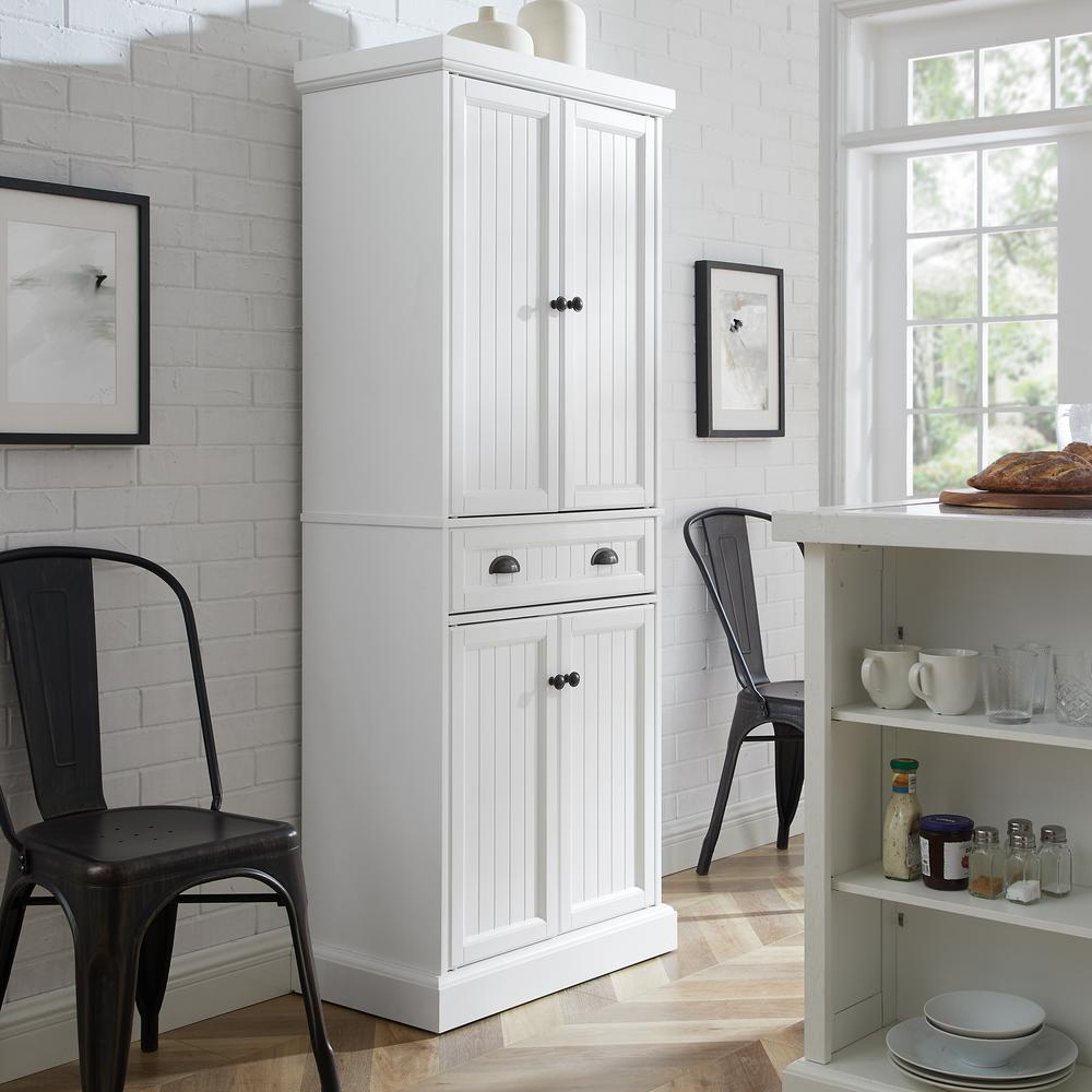 COASTAL STYLE: This storage pantry, featuring a classic white finish and beadboard paneling, brings beachy vibes to your kitchen. The bronze-finished metal hardware enhances its coastal charm. SPACIOUS STORAGE: The pantry features two cabinets with double doors, magnetic closures, and adjustable shelves. Each adjustable shelf has a weight capacity of up to 15 lbs. CONVENIENT DRAWER SPACE: The kitchen pantry has a large storage drawer on smooth ball-bearing glides, supporting up to 15 lbs. CLASSIC DESIGN: This storage cabinet showcases timeless design elements that complement modern farmhouse and traditional décor. It can be used as a linen cabinet, a coffee bar, or for laundry room storage. AMERICAN LEGACY: Inspired by over 100 years of the Crosley legacy, Crosley Furniture offers style for every space, from retro to modern. Crosley products are proudly designed in the USA and come with USA-based customer support. White finish Genuine metal hardware with a bronze finish Two adjustable and removable shelves in upper cabinet with a 15lb weight limit per shelf One adjustable and removable shelf in lower cabinet One large storage drawer on ball-bearing glides Beadboard paneling on door and drawer fronts Pairs well with traditional and farmhouse decor Wide drawer weight limit is 20lbs