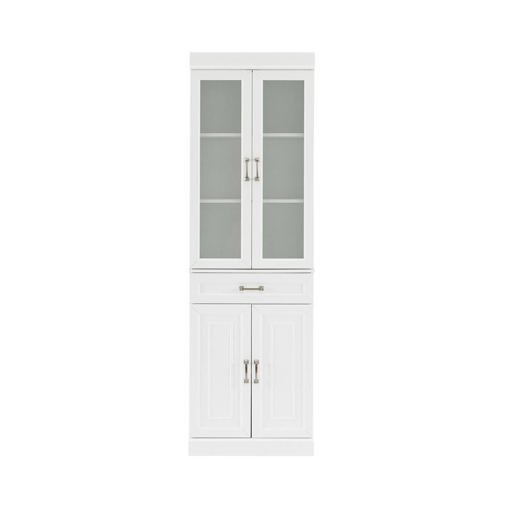 TRADITIONAL STYLE: With a classic white finish and metal hardware in brushed nickel, this kitchen pantry cabinet complements modern farmhouse decor styles. The upper cabinet's tempered glass doors add an extra touch of sophistication. SPACIOUS STORAGE: The upper cabinet includes two adjustable shelves, while the lower has one. Each shelf has a 15-lb weight limit. The full-extension storage drawer on ball-bearing glides also supports up to 15 lbs. THOUGHTFUL DESIGN: This storage unit features double cabinet doors with concealed hinges, and the lower doors and drawer front have classic recessed paneling. MODULAR DESIGN: This modular pantry cabinet can be paired with other items in the collection, allowing for customized storage solutions. AMERICAN LEGACY: Inspired by over 100 years of the Crosley legacy, Crosley Furniture offers style for every space, from retro to modern. Crosley products are proudly designed in the USA and come with USA-based customer support. White finish Genuine metal hardware in a brushed nickel finish Two adjustable and removable shelves in upper cabinet with a 15lb weight limit Adjustable shelf in lower cabinet with a 15lb weight limit Full-extension storage drawer on ball-bearing glides with a 15lb weight limit Upper cabinet has tempered glass doors Recessed paneling on lower cabinet doors and drawer front Modular design allows multiple units to be paired together or with other items in the collection