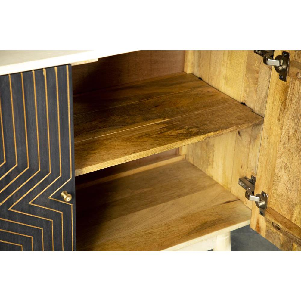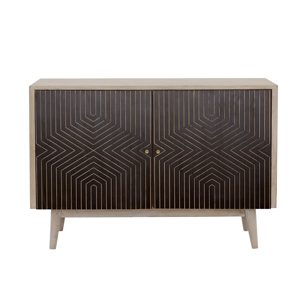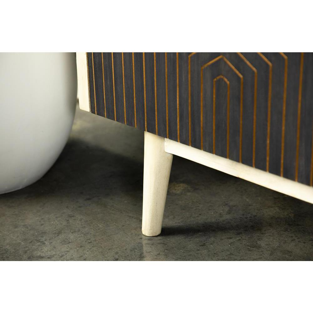 Make for an unexpected display with this incredible accent table. Crafted in India from solid mango wood, its gold geometric pattern forms an eye-catching diamond design on each cabinet door against a black finish. Meanwhile, the stark white finish of the frame creates an exceptional contrast. Rounded angled legs make for a mid-century modern appeal. This piece adds an eclectic vibe to your living space.