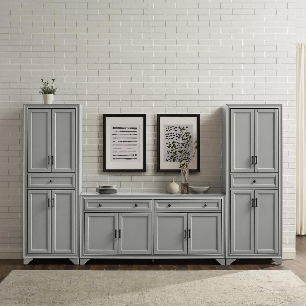 FARMHOUSE FLAIR: With a hand-rubbed, distressed gray finish, this sideboard pantry set adds a touch of modern farmhouse style to any space. The metal hardware features a distressed brass finish which complements traditional decor styles. SPACIOUS STORAGE: This set includes six cabinets with double doors, magnetic closures, and adjustable shelves, along with four full-extension drawers. Each shelf and drawer has a 15-lb weight limit, while the sideboard top has a 100-lb limit. MODULAR ORGANIZATION: This buffet and pantry set has the look of built-in cabinetry with a flexible modular design. Each pantry measures 23.75"W x 15"D x 67.75"H and the sideboard measures 61"W x 15"D x 29.63"H. CLASSIC STYLE: This kitchen storage pantry set features timeless design elements that seamlessly blend with traditional home décor. It also has four cable management holes with swivel covers so you can add a record player or stereo to your space. AMERICAN LEGACY: Inspired by over 100 years of the Crosley legacy, Crosley Furniture offers style for every space, from retro to modern. Crosley products are proudly designed in the USA and come with USA-based customer support. Distressed gray finish Genuine metal hardware in a distressed brass finish One adjustable shelf inside each cabinet with a 15lb weight limit per shelf Each pantry cabinet has a full-extension storage drawer on ball-bearing glides with a 15lb weight limit The sideboard has two full-extension drawers on ball-bearing glides, each with a 15lb weight limit Four pre-cut cable management holes with swivel covers All pieces are modular to maximize organization and storage Pairs well with traditional decor