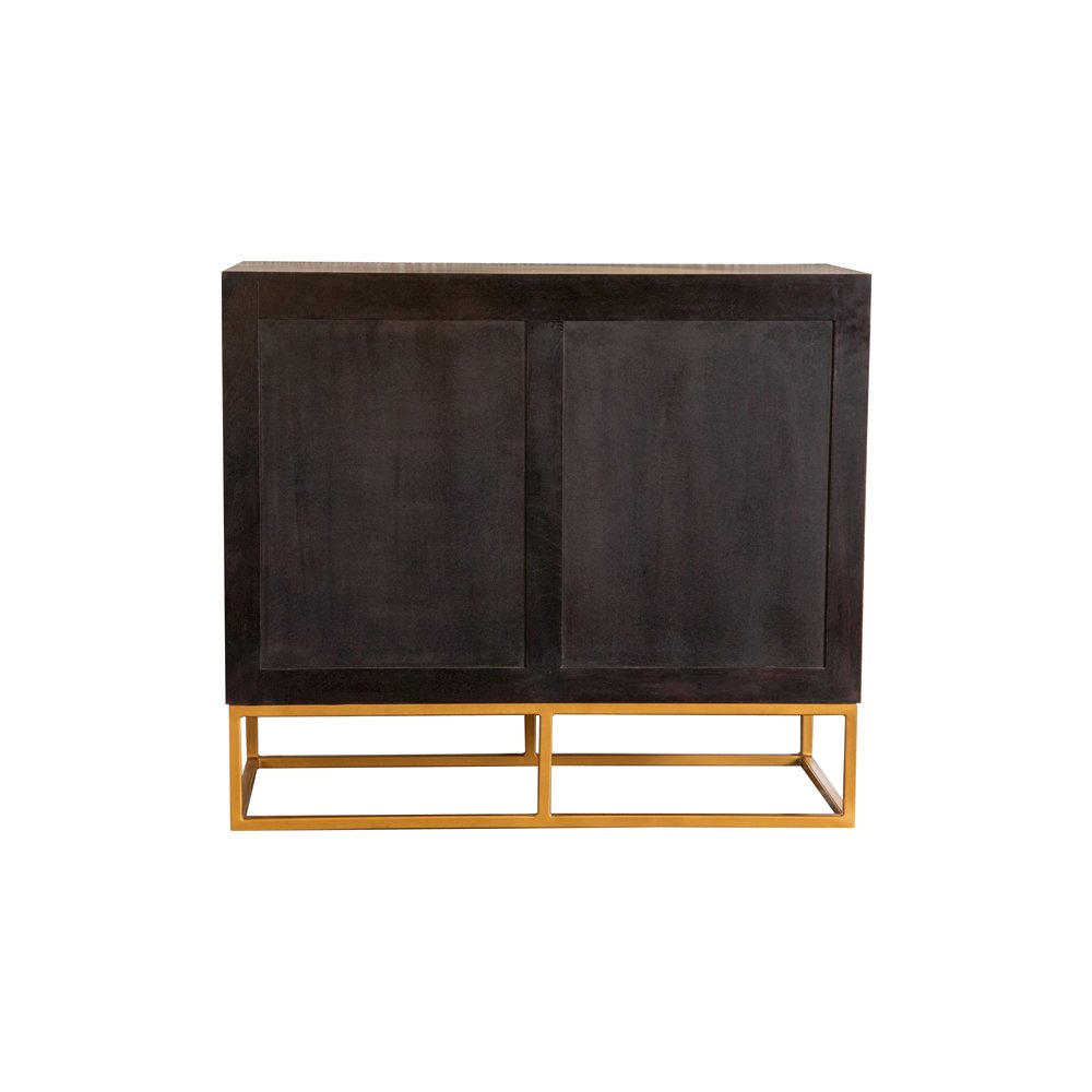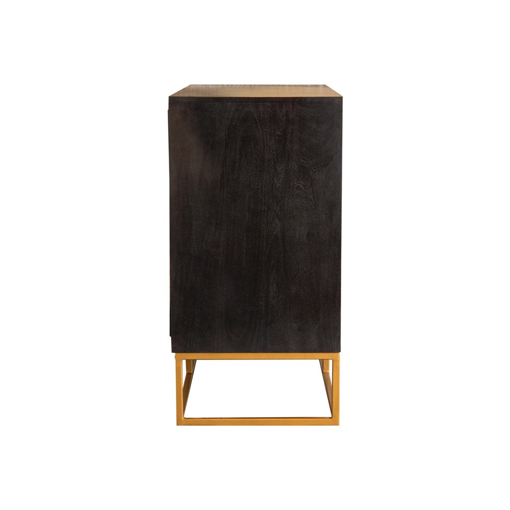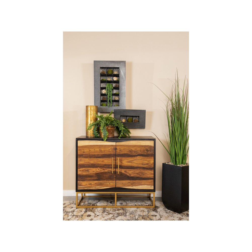 Beautifully designed sheesham and acacia wood two door accent cabinet Hand painted cabinet doors creates a bold look Hardware and metal base finished in gold Made in India
