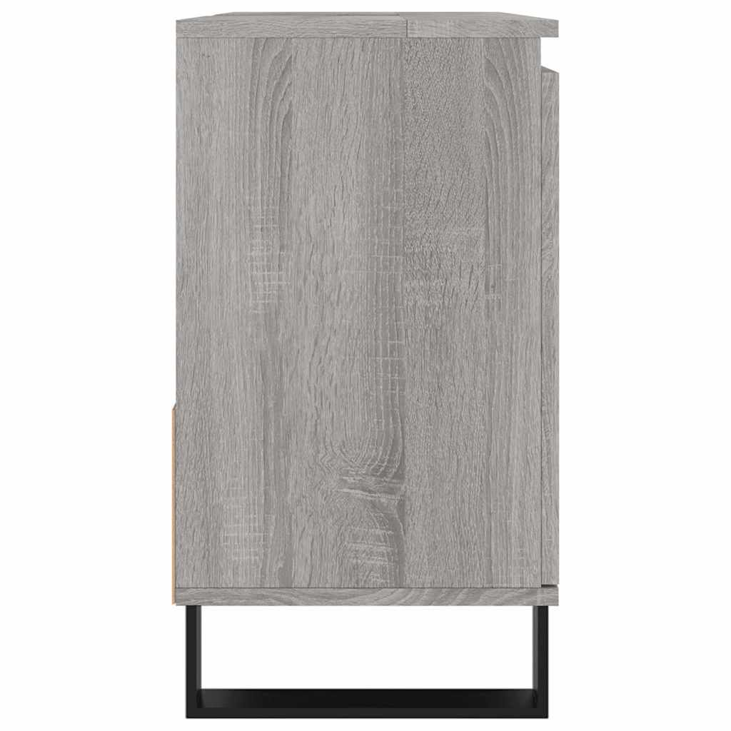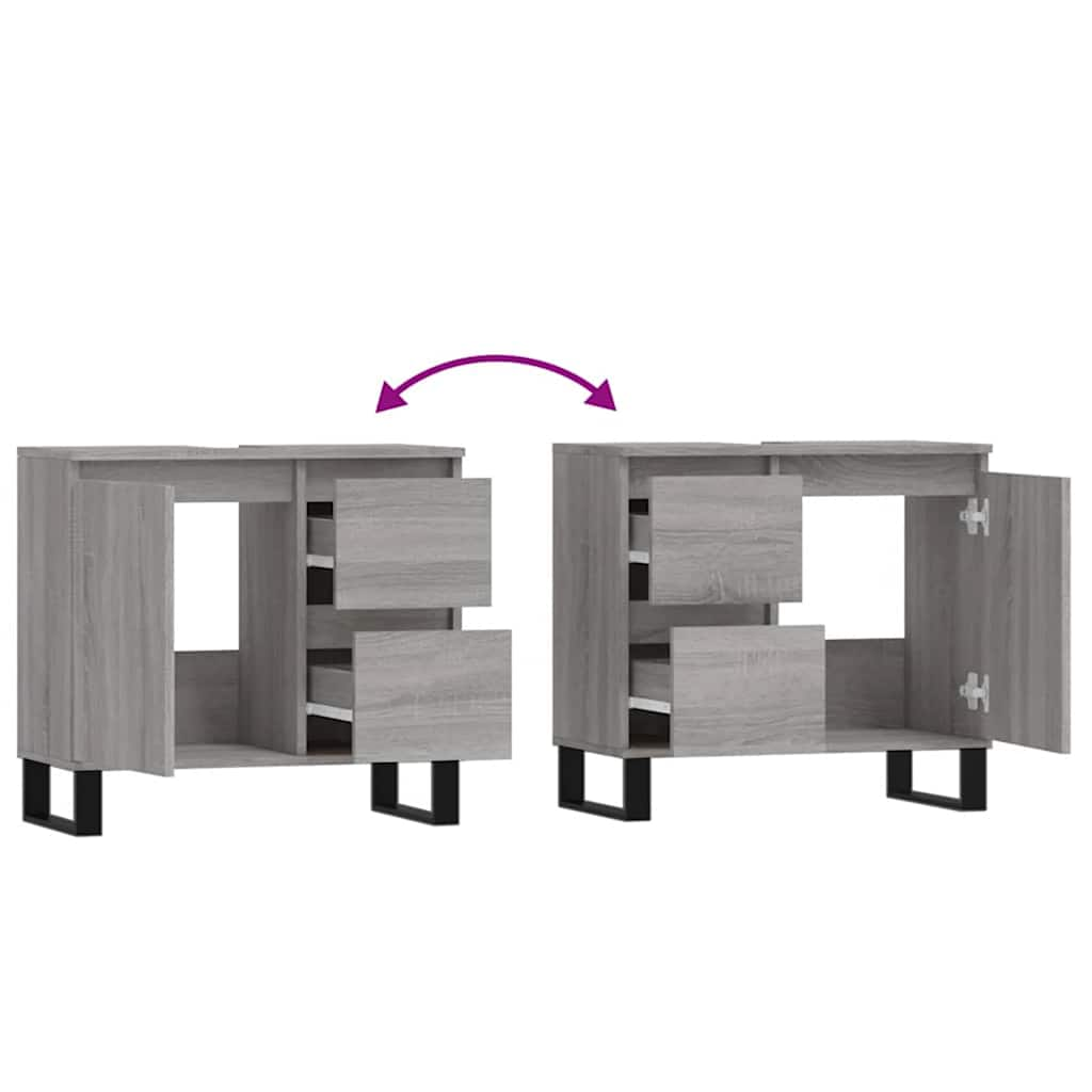 This modern bathroom cabinet blends simple and classy design with usability, making it just right for any bathroom. Its sleek grey Sonoma finish gives a sophisticated touch while ensuring there's loads of storage for your essentials. The sturdy engineered wood surface works great with hard-wearing iron legs and knobs, forming a stylish and solid way to organize your bathroom goodies.