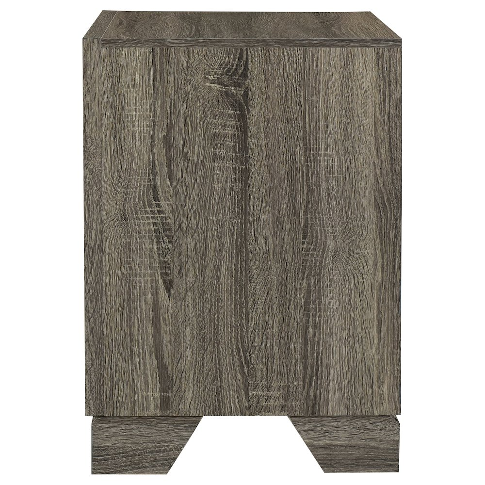Augment your styling and approachable bedside with a transitional two-drawer nightstand. Delivering a touch of farmhouse charm and casual ambiance, it provides plenty of storage at your bedside. Its wide top is ideal for a reading light or a vase, offering a perfect space for personal touches. A brown oak wood grain finish graces laminate surfaces that are specifically engineered to resist scratches and dents. Bar handles decorate drawer fronts while mitered trim and tapered block legs add the perfect touch of precision and dimensionality.